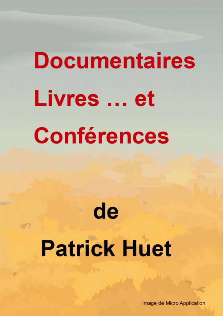 Si vous souhaitez commander un de ces documentaires, soit un livre soit une conférence (ou simplement pour des informations), contactez Patrick Huet au 06 99 71 69 69 (voir aussi la page « contact ».