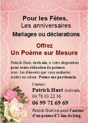 Que ce soit pour une fête, un anniversaire, un mariage, ou toute autre événement… Patrick Huet se tient à votre disposition pour composer à la personne de votre choix (ou pour vous-même) un poème totalement personnel avec le message que vous aimeriez communiquer.